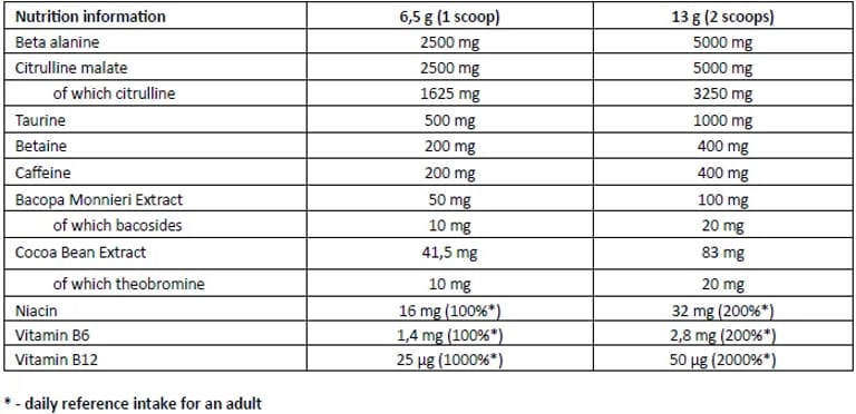 Vartojimas: 1 porciją (13 g) miltelių (2 samtelius) ištirpinkite 300 ml vandens. Gerkite po 1 porciją per dieną maždaug 30 minučių prieš treniruotę. Neviršykite rekomenduojamos paros dozės. Maisto papildai neturėtų būti vartojami kaip įvairios mitybos pakaitalas. Įvairi ir subalansuota mityba bei sveikas gyvenimo būdas yra svarbūs. Produktas skirtas sveikiems suaugusiesiems. Vaikams, nėščioms ar maitinančioms moterims produkto vartoti negalima. Nevartoti sergant ligomis, ypač diabetu ir širdies bei kraujagyslių ligomis, įskaitant hipertenziją. Nevartoti žmonėms, kuriems padidėjęs jautrumas kofeinui. Nevartoti kartu su kitais produktais, kurie yra kofeino šaltinis ar kitomis panašaus poveikio medžiagomis. Neviršykite 400 mg kofeino paros normos iš visų šaltinių. Nevartoti kartu su alkoholiu. Nevartoti prieš miegą.